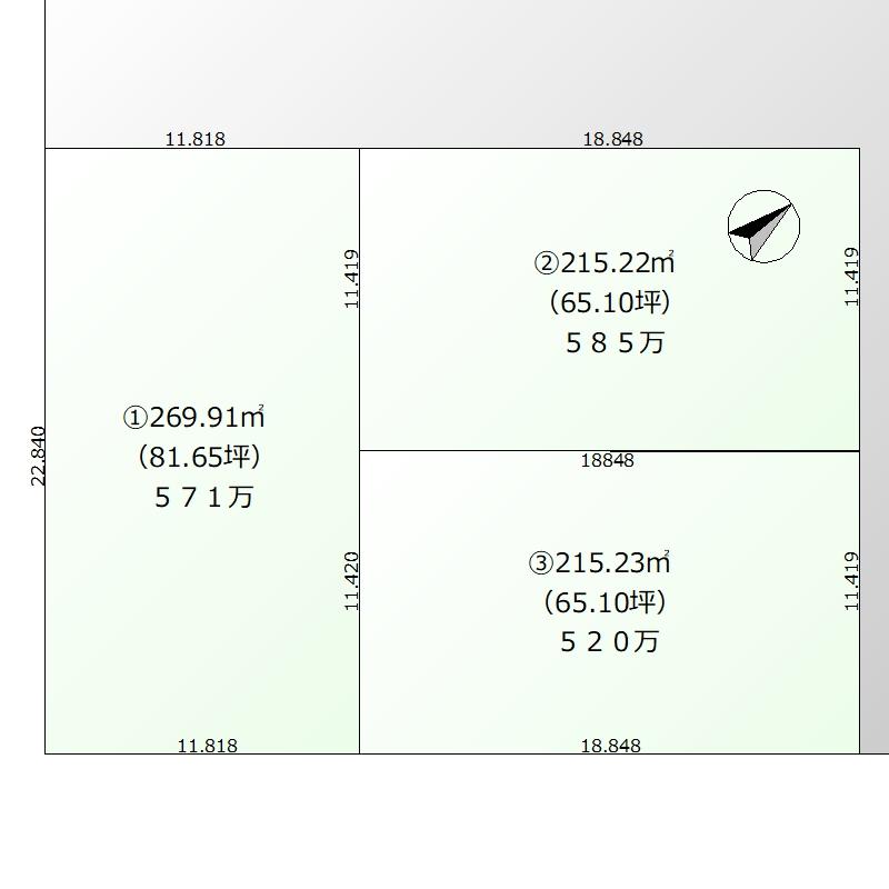 | 地積状況 | 北西向き 間口 11.818m 前面道路幅 7.27m |